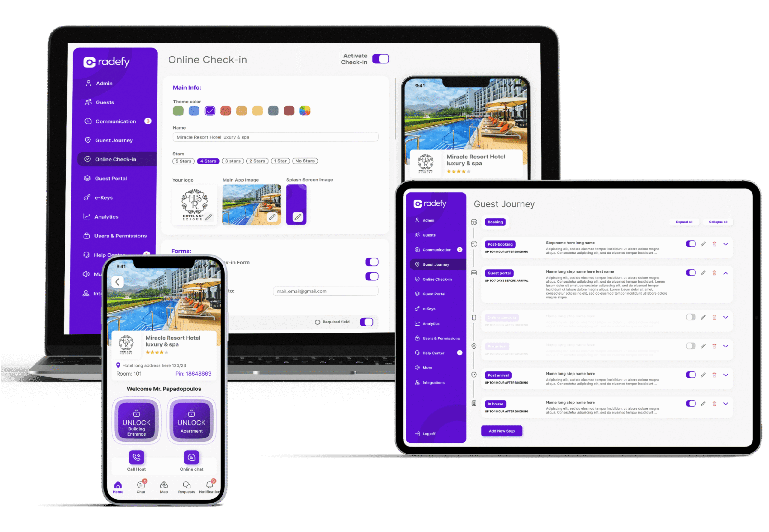 Radefy’s smart hospitality solutions empower businesses of all sizes, from luxury hotels to vacation rentals. Seamlessly integrated across your existing PMS, Channel Manager and ERP systems, our solutions provide unparalleled dependability and protection, empowering you to unlock your full potential, achieve remarkable results, and create unforgettable experiences for your guests.